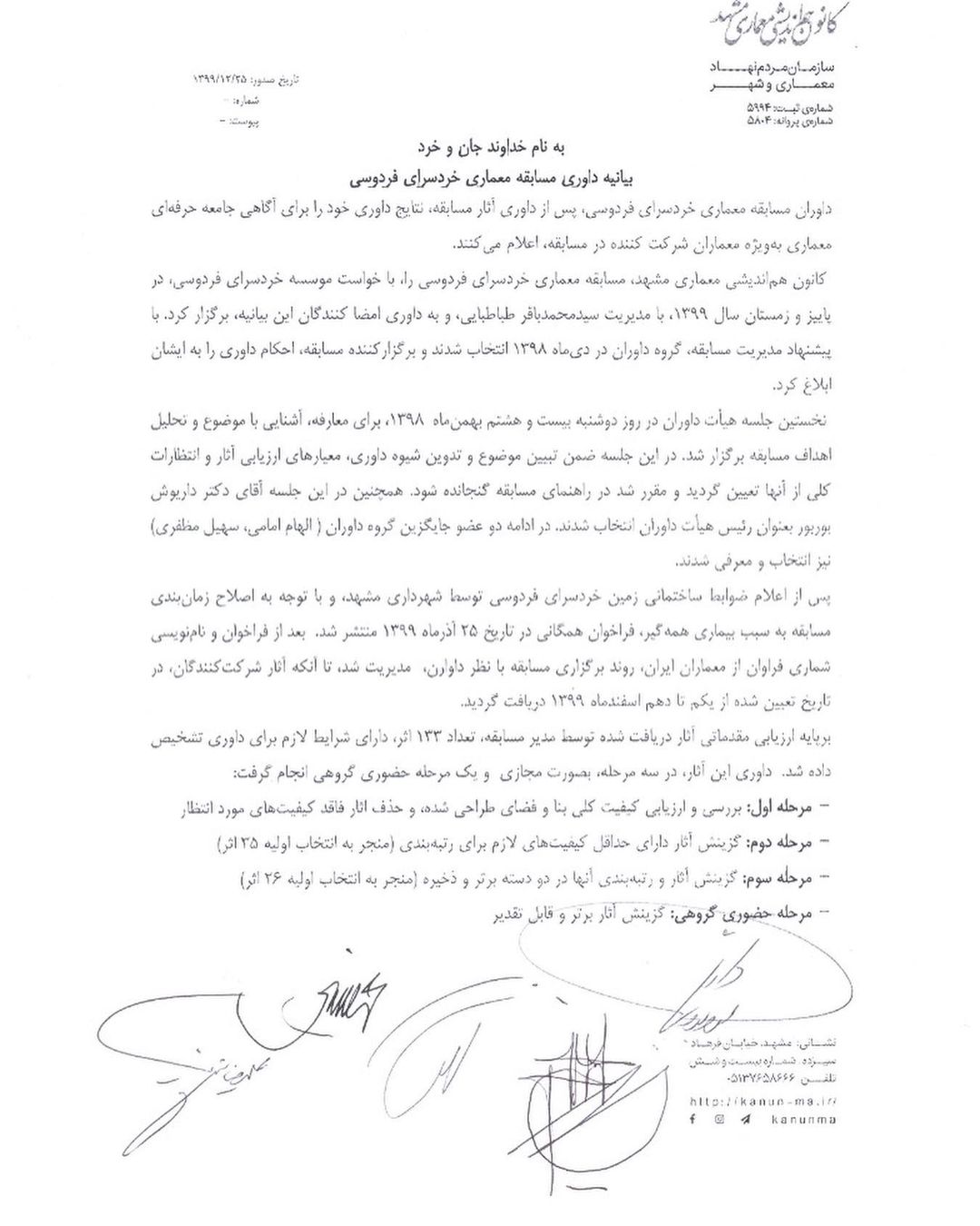 سایت اطلاع رسانی مسابقات معماری و شهرسازی ایران برگزارکننده ی هیچ مسابقه ای نیست و فقط مسابقات موجود را اطلاع رسانی می کند و از نیت هیچ برگزارکننده ای مطلع نیست که آیا نتایج را اعلام و جوایز را پرداخت می کنند یا خیر. بنابراین با توجه به جمیع شرایط موجود و با مطالعه کامل فراخوان و بررسی آن اقدام به شرکت یا عدم شرکت در مسابقه کنید. ضمنا اطلاع رسانی مسابقه دلیل بر این نیست که نقص نداشته باشد.